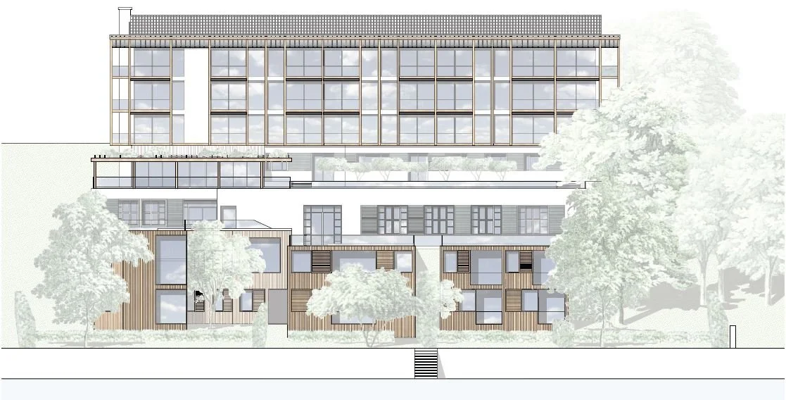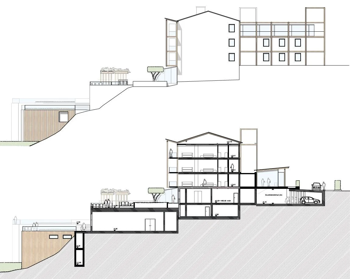 Auf der Nordseite bildet eine berglaste Rezeption den neuen Eingang auf Straßenebene. Eine neue Aufzug- und Stiegenanlage vor der Schwimmhalle verbindet das Hauptgebäude mit den beiden Ebenen der sechs Suiten und erschließt das Seeufer. Kontextuell folgen die Suiten der bestehenden Uferbebauung als Holzhäuser, alle mit Seeblick. Die Kubaturen der 3 Doppelhäuser werden nach ihrer Lage unterschiedlich definiert, innerhalb derer jeder Nutzer eine entsprechende Architektur verwirklichen kann.